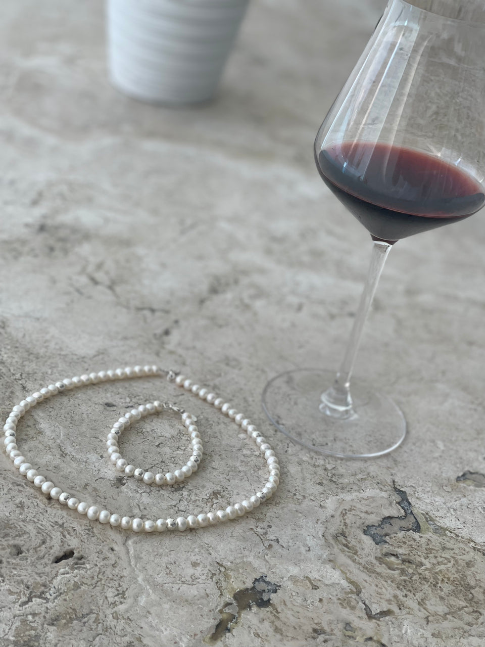 Dije con cadena de 45cms de largo, perla central lisa grande sobre base de plata y detalles de grecas texturizados, elaborado en plata 925.