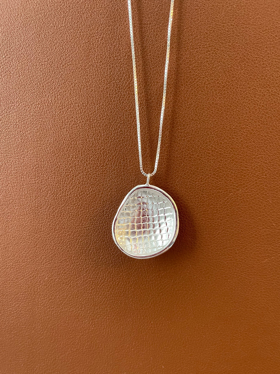 Dije y cadena de 48cms de largo, en forma de gota bombeada, realizado en plata 925.